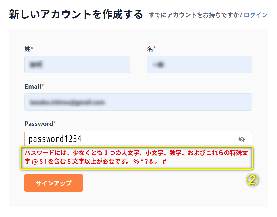 このとき、ログインのパスワードは、英大文字+小文字+数字+記号で8文字以上に設定する必要があるので注意しましょう。
